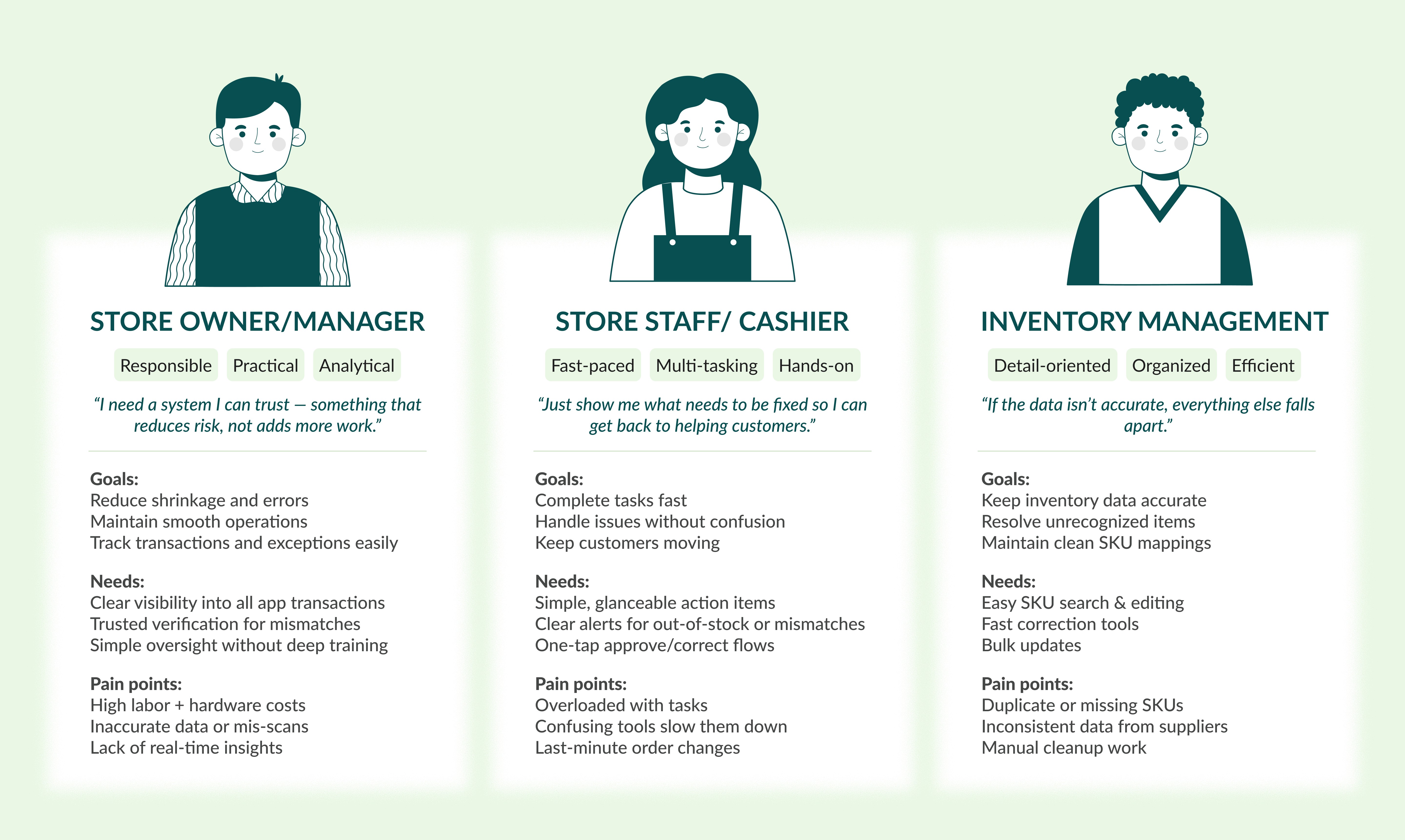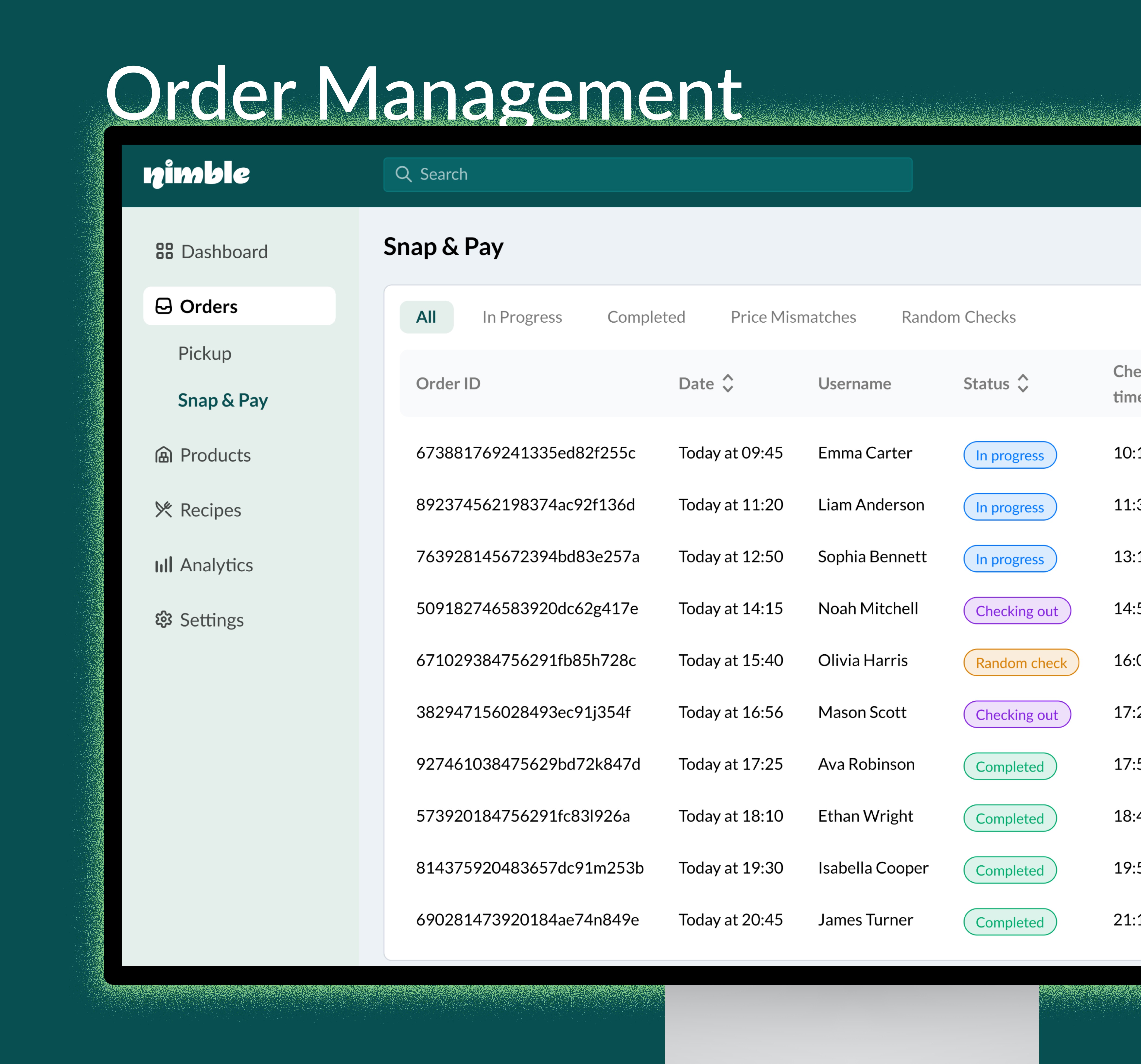 Nimble is a checkout and order management system that lets shoppers add items to their cart simply by snapping a photo—no barcodes, no kiosks. Using AI-driven product recognition, customers can scan, shop, and check out in under 30 seconds. While the shopper app feels straightforward and fast, the real complexity exists behind the scenes, where store staff must manage orders, verify items, resolve discrepancies and keep operations running smoothly. My work focused on designing the admin portal that makes this seamless experience possible.